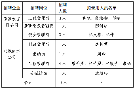 根據(jù)廈漳水資源公司、北溪供水公司2025年招聘公告,經(jīng)過(guò)報(bào)名、資格審查、筆試、面試等公開(kāi)招聘程序,現(xiàn)將13位擬錄用人員進(jìn)行公示。公示時(shí)間從2025年4月16日開(kāi)始,公示期為五個(gè)工作日。在此期間內(nèi),如有意見(jiàn)可通過(guò)來(lái)電、來(lái)信、來(lái)訪的形式反映情況。