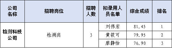 根據(jù)福建水投集團(tuán)檢測(cè)科技有限公司2025年第一批招聘公告,經(jīng)過(guò)報(bào)名、資格審查、筆試、面試等公開(kāi)招聘程序,現(xiàn)將3位擬錄用人員進(jìn)行公示。公示時(shí)間從2025年7月22日開(kāi)始,公示期為五個(gè)工作日。在此期間內(nèi),如有意見(jiàn)可通過(guò)來(lái)電、來(lái)信、來(lái)訪的形式反映情況。